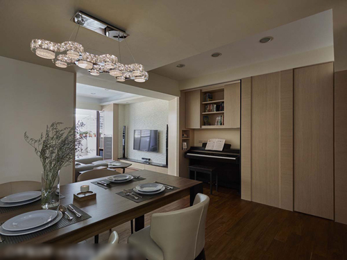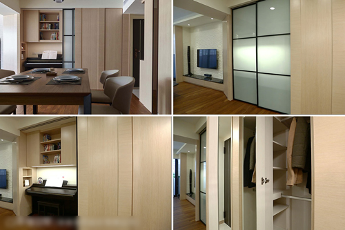 一般而言,梁下空间除了利用系统柜,做到顶天的收纳柜外,竟然还能藏进平时难以收纳的钢琴?设计师利用连动式的推拉门,让屋主能有一个ㄇ字型的隐藏式收纳空间,在钢琴上方有吊柜外,两侧也嵌进收纳层柜,把廊道升级拥有琴房功能。还不只如此喔!设计师更利用推拉门收起的宽度,在衣帽柜内设置了颇有深度的收纳层柜,满足屋主大量的收纳需求!