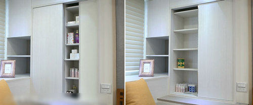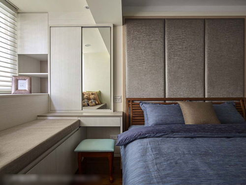 主卧房因为靠窗的柱角多,在设置化妆镜时,设计师更是不放过柱角边的15公分空间!将收纳柜的推拉门做成化妆镜,当拉门推开时,里面的5层柜足以收纳女屋主的瓶瓶罐罐,就连小编看完也觉得超心动的!