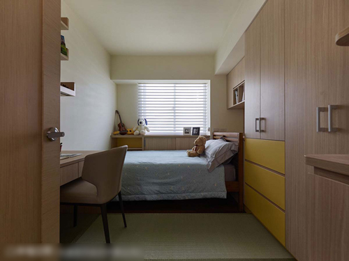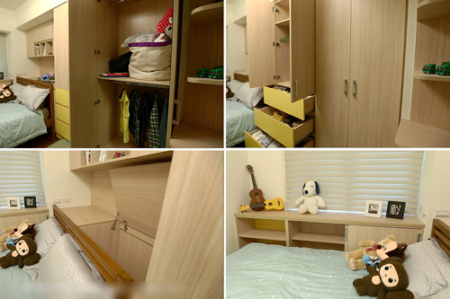 看完公领域的收纳提案,紧接着再来看看私领域有哪些创意巧思?在儿子房部分,设计师巧用大梁下方的空间,设置整排衣柜、吊柜与棉被柜,不只解决收纳问题,也避免梁压床的风水禁忌。而在床尾部分,设计师更是用窗台边整排的腰柜,让屋主能够将过多的生活用品,通通藏进柜中,保持清爽视觉。