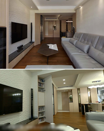 碍于空间并不宽敞,因此电视墙并未做太宽,也因此与钢琴的隐藏式收纳层柜有了一段落差。设计师便利用这个落差的斜面,毫无浪费地创造了一个放置CD的隐藏式收纳柜!