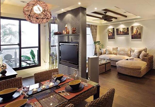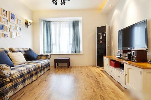 少用大型的酒柜、电视柜等,以使空间的分割单纯化。如果大型家具十分需要,则往角落放置为好。特别是沙发的选用要谨慎,稍不留神就会占去半个客厅。