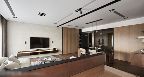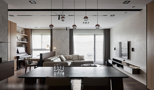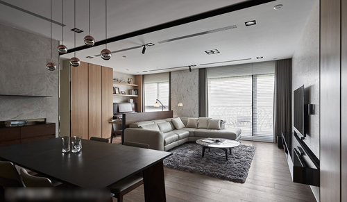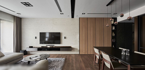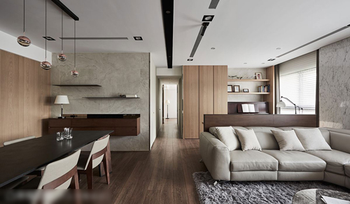 和煦的空间温度,任谁一进屋就能感受到,其实早在设计之初,设计师就已经相中这整面大窗,希望依此做为全屋不断电系统,她认为“当空间有了温度,家人间就能更增添暖度。”因此决定舍弃隔间,透过光线大角度折射提升温度,同时变换空间素材,在以木质为主要材质,搭配仿意大利石材砖及仿大理石饰板交替铺饰,空间立面展现优雅美感;当横铺面取得视觉焦点,潘柏菁设计师最后更借由空间里的端景处理,让空间更显延伸,温暖余韵在每个角落驻足。