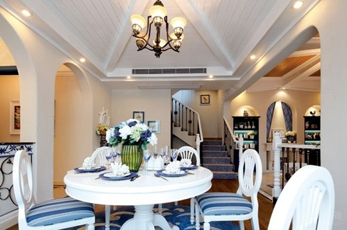 地中海风格具有独特的色彩美感,色彩利用即大胆又明亮,结合和蓝天、大海、海盗船等家庭装修设计风格,散发出质朴天然的海洋气息。软装以窗帘、桌巾、等以棉织品为主,让整个居住环境变得舒适。